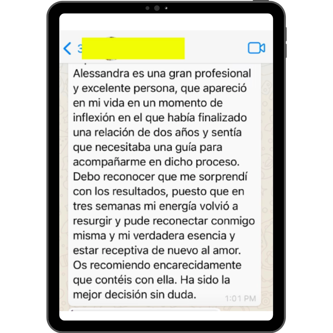 Todas mis relaciones eran tóxicas, los hombres que llegaban a mi eran o controladores o se desaparecían y no me explicaban por qué. Yo sabía que algo yo tenía que sanar para poder conectar con hombres de alto valor. Empecé a trabajar con Alessandra y en cuestión de semanas mi vida cambió. Empecé no sólo a conocer gente maravillosa, sino que además conocí a un hombre que es todo lo que yo quería y no sabía como atraer. Alessandra me mostró el camino.